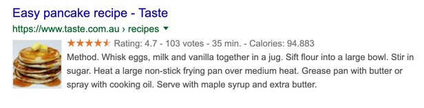 Rich snippets are the top results that appear in your search which include star ratings and extra information. If you search ‘pancake recipe’ you will probably find the top results are linking to pancake recipes and include a star rating and extra info about the cooking time, etc. Other examples can include, products with a star rating and retail price, or a business with a star rating and address.