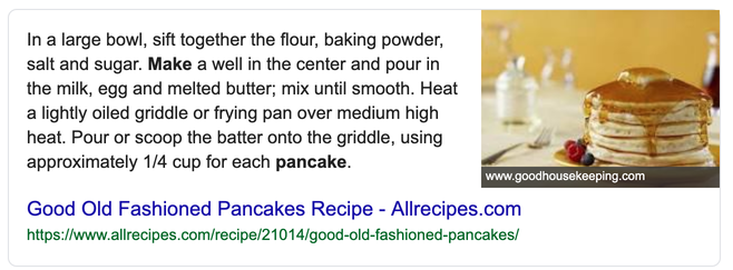 Whereas, featured snippets usually (not always) answer a question and will appear in a list, paragraph or table format. If you search ‘How do I make pancakes’, it will probably appear with the method of the top pancake recipe result, the link to the full recipe and the related image. Other examples of this might include a step-by-step method to a task in a list format or dates and times for an event in a table.